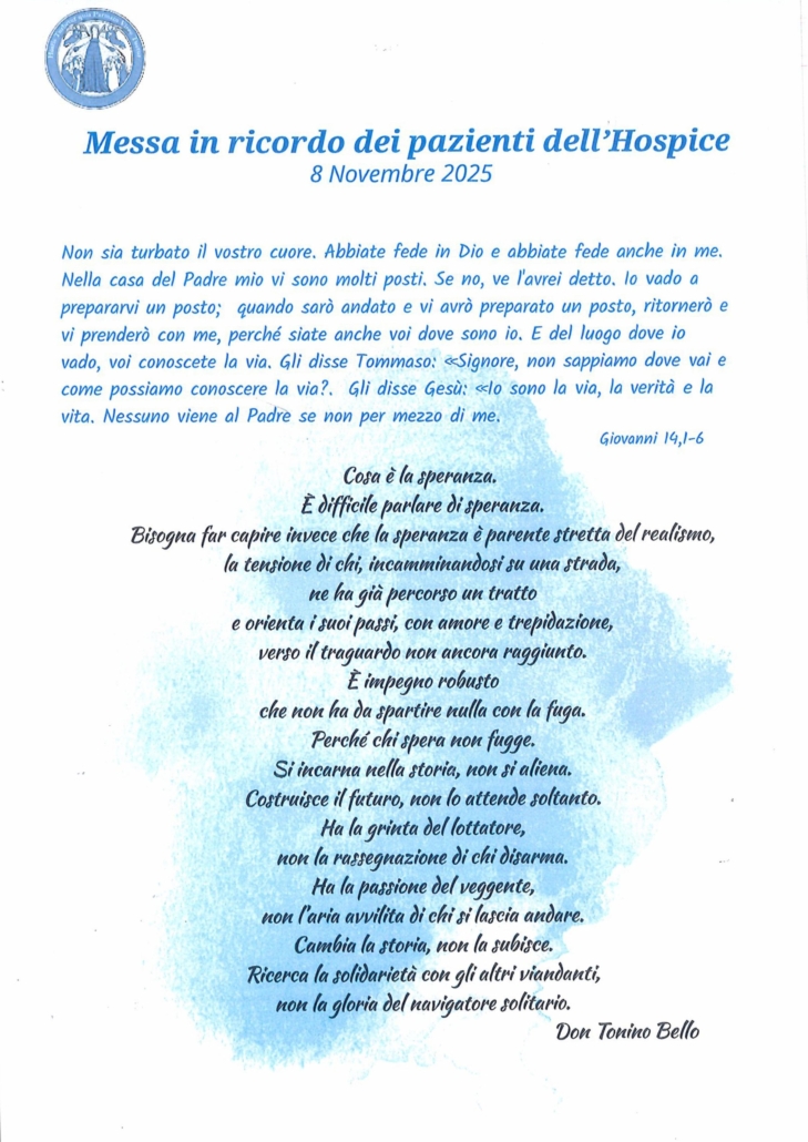 8 novembre celebrazione in ricordo dei defunti dell’Hospice